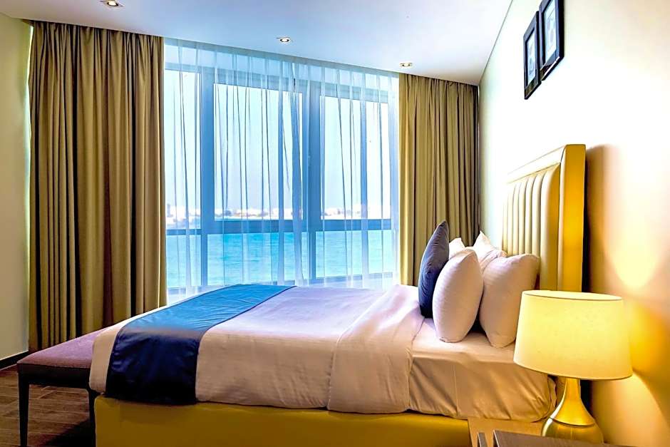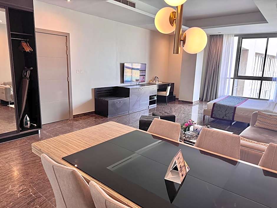 This panoramic room offers views of the infinity pool and the sea. It also includes a living room with lounge and work-station.